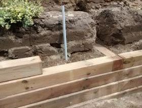 As the saturated soil freezes and thaws this causes expansion and contraction of the affected area. That is why it is important to try and get rid of the water and not allow it to rest in the soil up against the retaining wall.Timber retaining walls should lean into the slope of land an inch or more for each foot of pressure treated wood applied. We use 6×6 boards so they being between 1/2 inch to 3/4. Each board stepping up from the last.